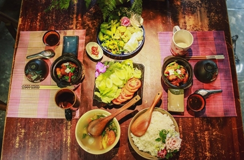 Các món phục vụ quen thuộc trong bữa cơm người Việt như thịt luộc cà pháo, cá kho tộ, canh chua. Điều đặc biệt khác của quán là các đĩa thức ăn được trang trí bằng hoa tươi rất tỉ mỉ. Khách đến ăn thường phải đặt trước, giá một người là 120.000 đồng.
