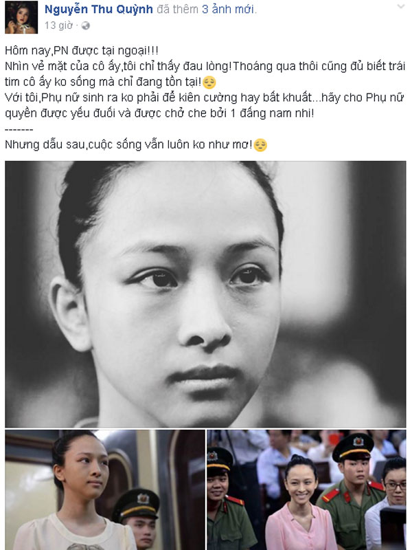 Ngoài Chí Trung, còn có diễn viên "Sống chung với mẹ chồng" Thu Quỳnh bày tỏ tình cảm với bị cáo Phương Nga. Cô viết: "Hôm nay, Phương Nga được tại ngoại. Nhìn vẻ mặt của cô ấy, tôi chỉ thấy đau lòng. Thoáng qua thôi cũng đủ biết trái tim cô ấy không sống mà chỉ đang tồn tại. Với tôi, phụ nữ sinh ra không phải để kiên cường hay bất khuất. Hãy cho phụ nữ quyền được yếu đuối và được chở che bởi một đấng nam nhi".