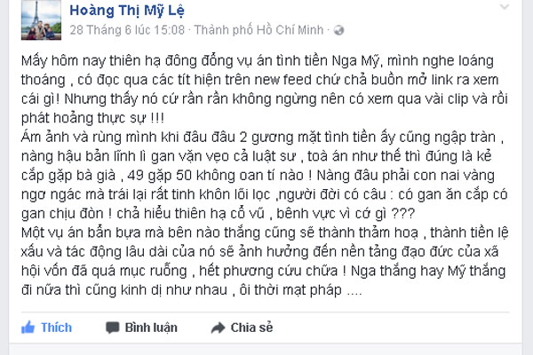 Đồng quan điểm với ca sĩ Tóc Tiên, Mỹ Lệ cũng đồng tình với việc không nên tung hô cổ vũ. Hơn thế, nữ ca sĩ gốc Huế còn thẳng thắn: "Người đời có câu: Có gan ăn cắp có gan chịu đòn. Chẳng hiểu thiên hạ cổ vũ, bênh vực vì cớ gì?".