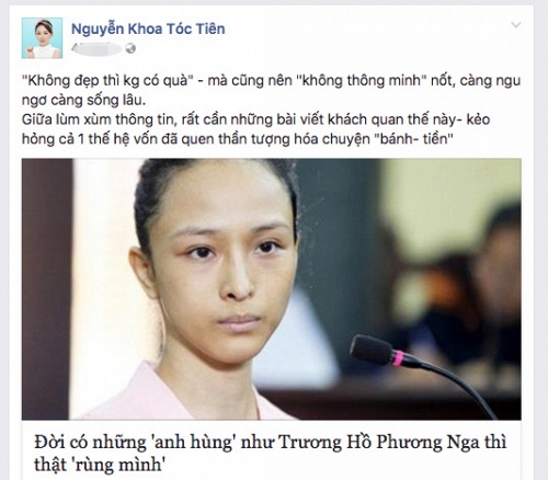 Chia sẻ trên trang Facebook cá nhân của mình, nữ HLV Giọng hát Việt 2017 cho rằng: “”Không đẹp thì không có quà” – mà cũng nên ‘không thông minh’ nốt, càng ngu ngơ càng sống lâu. Giữa lùm xùm thông tin, rất cần những bài viết khách quan – kẻo hỏng cả 1 thế hệ vốn đã quen thần tượng hóa chuyện ‘bánh – tiền’…”.
