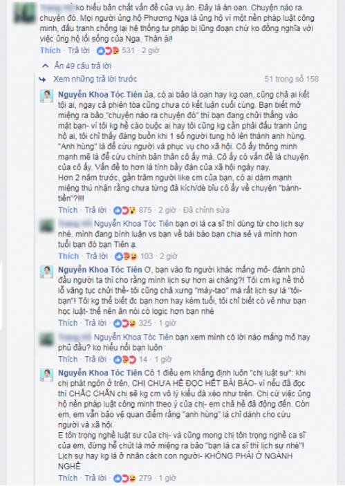 Quan điểm của Tóc Tiên nhanh chóng thu hút nhiều sự tranh luận gay gắt từ mọi người. Trong đó, có một cư dân mạng cho rằng nữ ca sĩ không hiểu bản chất vấn đề của vụ án: “Đây là án oan. Chuyện nào ra chuyện đó. Mọi người ủng hộ Phương Nga là ủng hộ vì một nền pháp luật công minh, đấu tranh chống lại hệ thống tư pháp bị lũng đoạn chứ không đồng nghĩa với việc ủng hộ lối sống của Nga“.