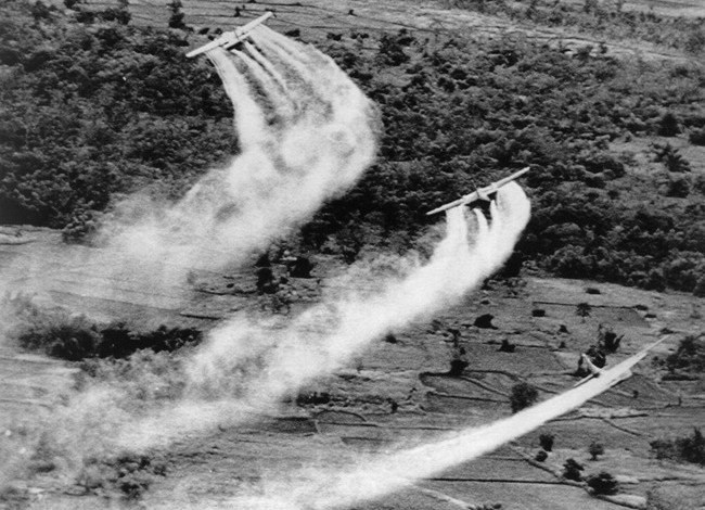 Được sử dụng như một thứ vũ khí phát quang, dioxin hay chất diệt cỏ vốn ban đầu chỉ có tác dụng diệt cỏ, phá hủy cây cối, hoàn toàn không ảnh hưởng tới người sử dụng hoặc người hít phải vào thời gian ban đầu. Nguồn ảnh: Links.