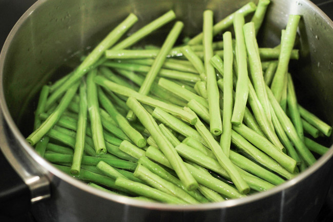 - Đun sôi nồi nước, cho thêm một chút muối rồi luộc đậu đũa trong 3 phút (đảm bảo đậu đã được nấu chín nhưng vẫn xanh). Vớt đậu ra ngoài và ngâm trong nước đá.