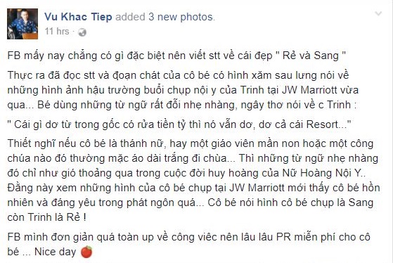 "Thiết nghĩ nếu cô bé là thánh nữ, hay một giáo viên mần non hoặc một công chúa nào đó thường mặc áo dài trắng đi chùa... Thì những từ ngữ nhẹ nhàng đó chỉ như gió thoảng qua trong cuộc đời huy hoàng của Nữ Hoàng Nội Y.. Đằng này xem những hình của cô bé chụp tại JW Marriott mới thấy cô bé hồn nhiên và đáng yêu trong phát ngôn quá... Cô bé nói hình cô bé chụp là Sang còn Trinh là Rẻ !". Ông bầu Vũ Khắc Tiệp đáp trả nữ blogger.