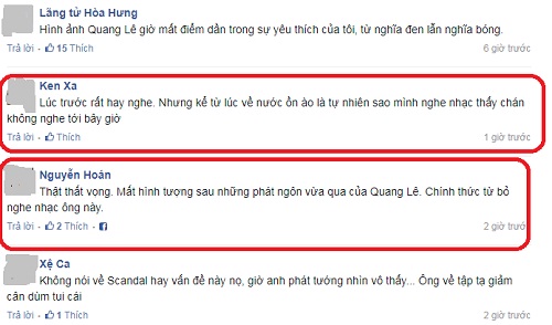"Anh Lê ơi, anh nên chú ý lời nói của mình nhé", "Thật thất vọng! Mất hình tượng sau phát ngôn của Quang Lê", "Ai còn dám yêu Thanh Bi nữa", "Đánh mất hình tượng của mình trong mắt khán giả"...là một trong số rất nhiều những chia sẻ của fan gửi đến Quang Lê sau phát ngôn này.