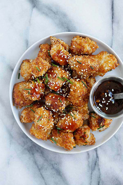 - Gắp thịt gà ra đĩa, rưới hỗn hợp nước sốt lên, trang trí với vừng rang và hành lá/lá chanh.