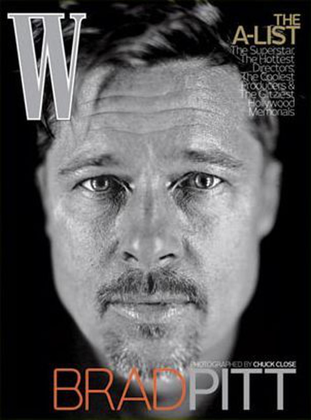 Brad Pitt không chỉ phản đối việc sử dụng Photoshop mà còn chấp nhận những bức ảnh thẻ hiện hết những "khuyến khuyết" về ngoại hình của mình. Một trong số đó là tấ hình được chụp bởi Chuck Close cho bìa tạp chí W. Nhiếp ảnh gia này nổi tiếng là người có những tấm hình chân thực, bộc lộ cả những điểm không hoàn hảo ở chủ thể.