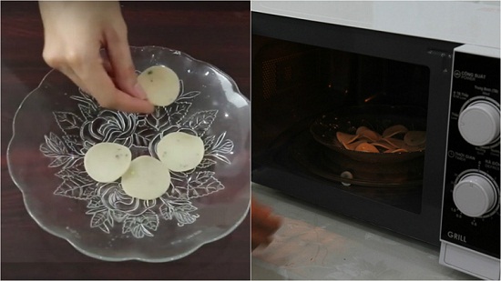 Đầu tiên, các bạn cần chuẩn bị một đĩa chịu nhiệt, có thể dùng được trong lò vi sóng, sau đó cho vài lát bánh phồng tôm lên đĩa rồi cho vào lò vi sóng.