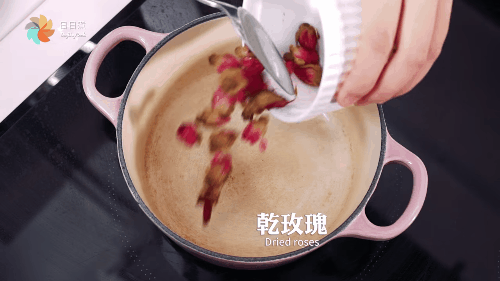 - Đầu tiên, các bạn cho hoa hồng khô và bụt giấm vào một chiếc bát hoặc nồi to rồi cho nước nóng vào.