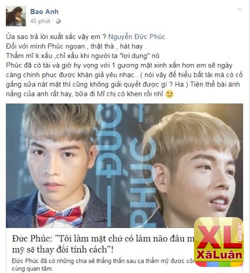 Gần đây cộng đồng mạng xôn xao trước sự thay đổi ngoại hình đến bất ngờ của Đức Phúc. Nhiều người chúc mừng Đức Phúc có gương mặt mới đẹp trai hơn. Nữ ca sĩ Bảo Anh mới đây bất ngờ đăng dòng trạng thái khi thấy Đức Phúc phẫu thuật thẩm mỹ.