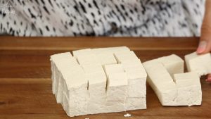 - 1 bìa đậu hũ (6 oz/170g). Gói trong mảnh giấy thấm "paper towel" cho bìa đậu hũ ráo hết nước. Sau đó, chẻ đôi bìa đậu hũ. Sau đó nữa, cắt đậu hũ thành những miếng vuông vức 1.5 cm x 1.5 cm.