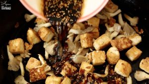 4. Cho nước sốt gia vị vào chảo đậu hũ + nấm. Khuấy đều trong vài phút. Vặn nhỏ lửa. Cho hành lá vào. Khuấy thêm lần nữa trước khi tắt bếp.