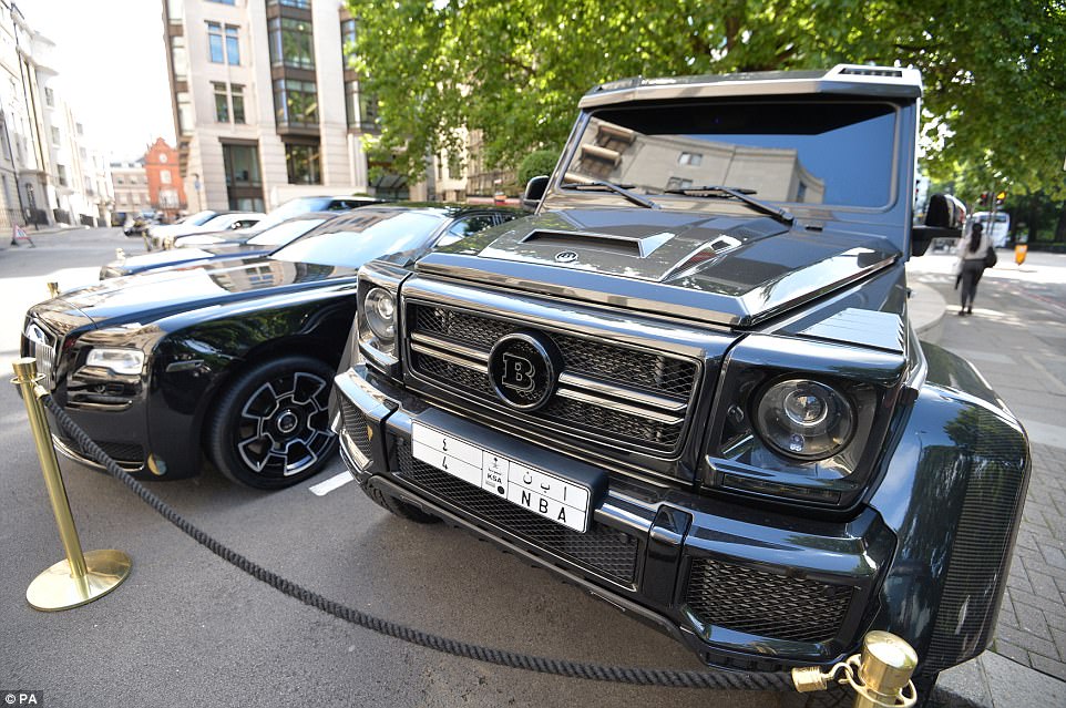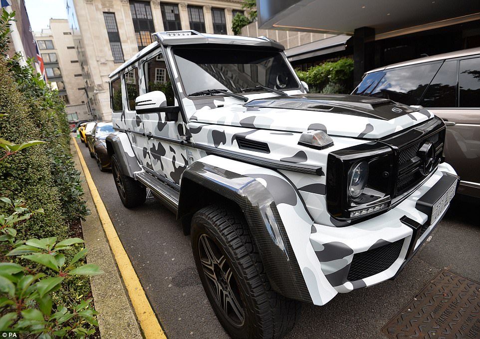 Ngoài ra, còn có một chiếc Lamborghini bạc với đường kẻ màu đỏ, có giá tới 192.000 bảng Anh (5,8 tỷ đồng) và một chiếc Brabus 4x4, có giá tới 240.000 bảng Anh (7,2 tỷ đồng), đỗ bên ngoài khách sạn Dorchester .