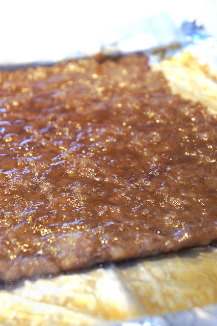 Lấy tô thịt khỏi tủ lạnh, trải thịt thành từng lớp mỏng thật đều trên khay nướng hình chữ nhật. Với công thức này bạn sẽ làm được khoảng 3 khay.