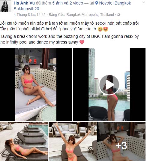 Trên trang facebook cá nhân, Hà Anh viết: “Đôi khi tớ muốn kín đáo mà fan tớ lại muốn thấy tớ sẹc-xi nên bất chấp trời đầy mây tớ phải bikini đi bơi để "phục vụ" fan của tớ”.