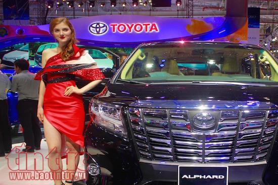 Triển lãm lần này, hãng Toyota chọn người mẫu với trang phục màu nóng chủ đạo để làm nổi bật sản phẩm của mình.