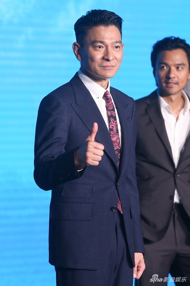 Lưu Đức Hoa hào hứng chạy lên sân khấu khi MC nhắc tới tên mình trong buổi họp báo quảng bá phim Phi vụ cuối cùng.