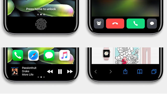 Đoạn video ngắn trên YouTube của ConceptsiPhone mô tả iPhone 8 với thiết kế không có nút Home và cảm biến vân tay được nhúng vào màn hình. Phía dưới cùng iPhone 8 cũng có bảng điều khiển cảm ứng tương tự Touch Bar trên MacBook Pro. Nó có thể thay đổi chức năng phụ thuộc vào ứng dụng đang được sử dụng.