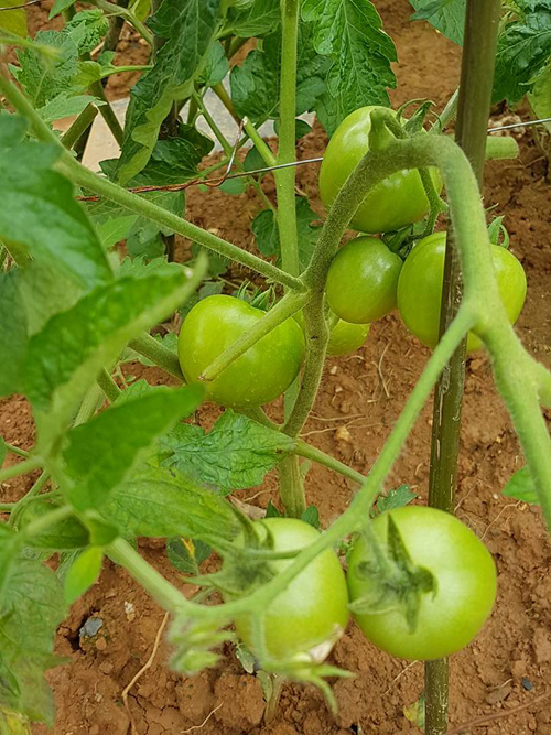 Để tiết kiệm diện tích, ca sĩ Việt Hoàn trồng xen kẽ nhiều loại cây trồng. Cà chua được trồng phía dưới dàn mướp đắng sai lúc lỉu đợi người hái.