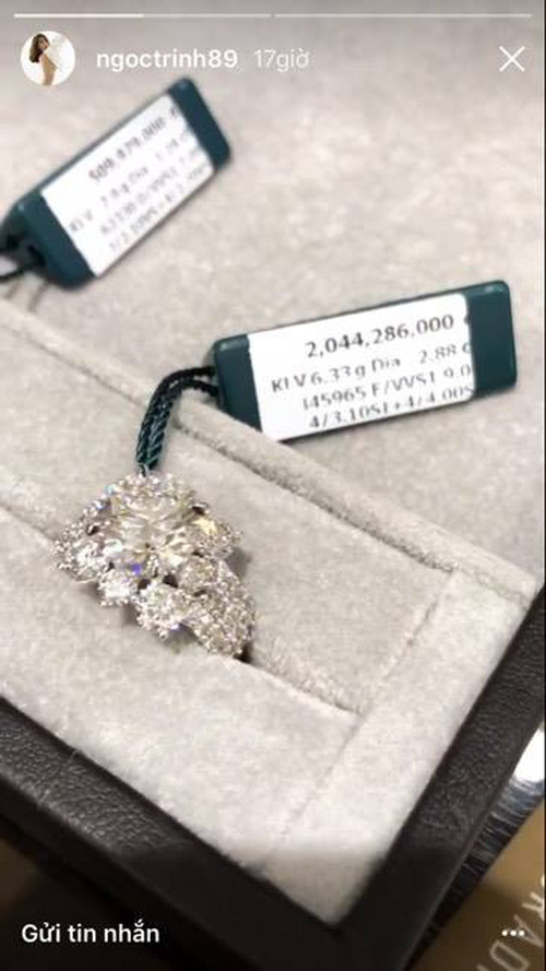 Mới đây, trên trang cá nhân Instagram của mình Ngọc Trinh khoe hình ảnh chiếc nhẫn kim cương có giá hơn 2 tỷ đồng. Nhiều người cho rằng, Ngọc Trinh tự thưởng cho mình sau những nỗ lực làm việc. Nhiều ý kiến bình luận, chiếc nhẫn là món quà người yêu mới của Ngọc Trinh tặng cho cô.