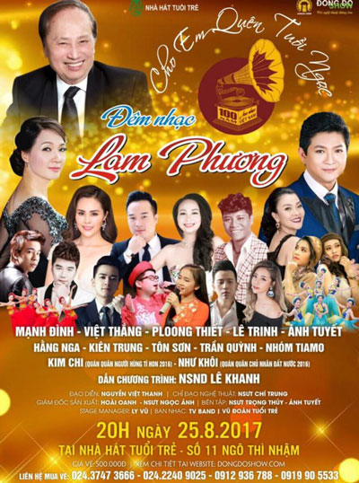 Được biết, live concert Lam Phương "Cho em quên tuổi ngọc" sẽ diễn ra vào ngày 25/8 tới đây tại Nhà hát Tuổi trẻ, 11 Ngô Thì Nhậm, Hà Nội.