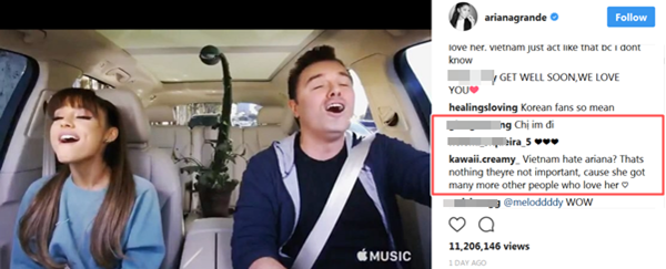 Nhiều bạn không kiểm soát được cảm xúc khi dùng từ ngữ nặng nề để nói về việc hủy show này. Những cụm từ như "đừng bao giờ trở lại Việt Nam" hay "cô ấy thật coi thường chúng tôi"... là những cụm từ được để lại nhiều nhất. Trước đó, việc chỉ đăng lời xin lỗi trên Instgram của Ariana Grande bị nhiều người nhận xét là coi thường khán giả.
