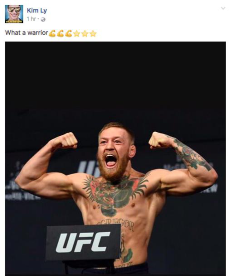 Trên trang cá nhân, Kim Lý chia sẻ hình ảnh của Conor McGregor với lời bình luận: "Anh thực sự là một chiến binh". Việc nam tài tử gốc Việt theo dõi trận đấu đỉnh cao này là điều dễ hiểu, nhưng điều bất ngờ là Hồ Ngọc Hà cũng theo dõi cuộc tỷ thí quyền anh này.