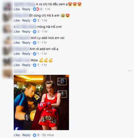 Trên trang cá nhân, "Nữ hoàng giải trí" hài hước chia sẻ: "Cũng bày đặt bị dụ xem trận boxing thế kỷ... Học một chút chiêu trò để tự vệ". Cách nói chuyện của Hà Hồ khiến rất nhiều fans đã háo hức, cho rằng Hà Hồ đang yêu nên "chiều lòng" Kim Lý, cùng đi xem trận so găng tỷ USD dù chưa chắc cô cảm thấy hứng thú.