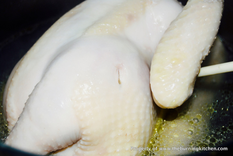 Đổ 3 lít nước vào nồi sâu và đun sôi trên lửa to. Sau khi nước sôi, trụng cả con gà vào trong nồi nước 3 lần này rồi cuối cùng để cả con gà ngập trong nồi nước. Trước khi bạn cho gà vào nồi, hãy gấp cánh gà ngược lại.