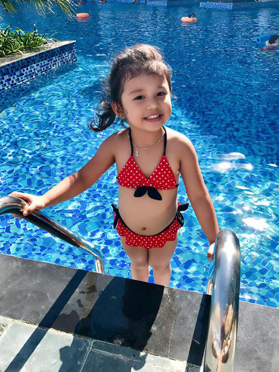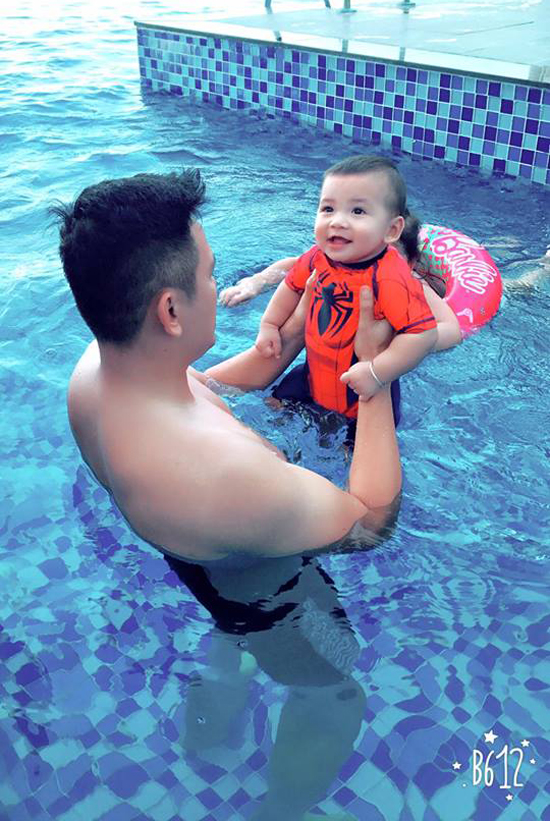 Bé Nu mới 9 tháng tuổi nhưng rất dạn dĩ. Cậu nhóc không hề sợ nước khi được bố ẵm xuống bể bơi.