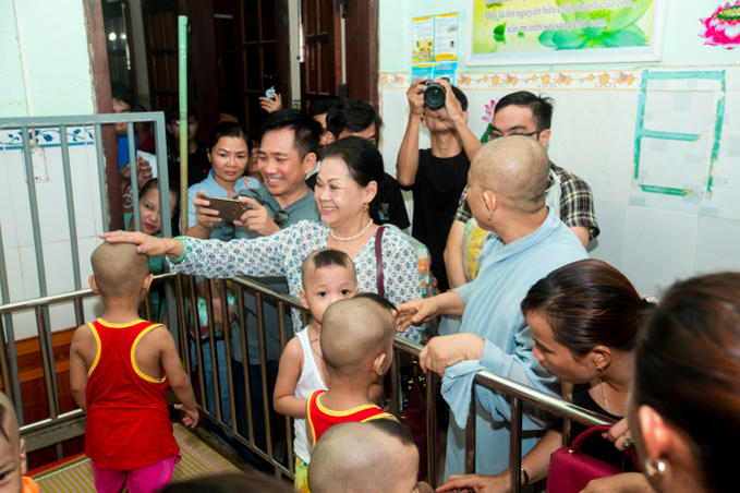 Nữ danh ca Khánh Ly (áo trắng) có chuyến thăm mái ấm tình thương tại chùa Quang Châu tối 5/9. Ảnh: CaroMedia.
