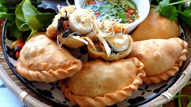 Lớp vỏ bánh gối vàng rộm, giòn tan, cắn một miếng đã thấy nhân thịt ngập trong miệng. Bánh có nhân ngon, thơm, thường ăn kèm với chút nước mắm chấm chua ngọt.