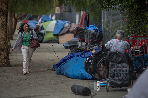 Vì thiếu nhà, số người vô gia cư gia tăng mạnh tại California. Trong hình là người vô gia cư sống trên đường Spring Street tại Los Angeles trong tháng Năm 2017. (David McNew/ Getty Images)