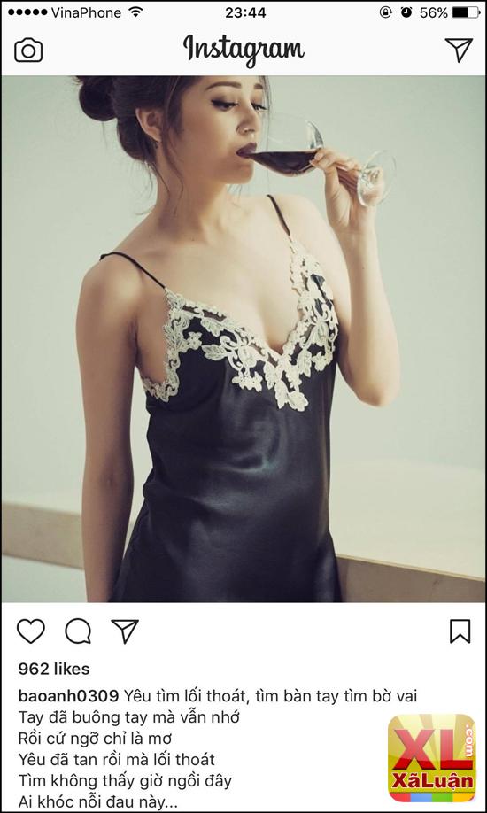 Cách đây ít tiếng, giọng ca “Yêu 1 người vô tâm” cập nhật thêm hình ảnh ăn mặc gợi cảm và uống rượu lên Instagram kèm dòng chữ chất chứa nỗi buồn: “Yêu tìm lối thoát, tìm bàn tay tìm bờ vai. Tay đã buông tay mà vẫn nhớ. Rồi cứ ngỡ chỉ là mơ. Yêu đã tan rồi mà lối thoát. Tìm không thấy giờ ngồi đây. Ai khóc nỗi đau này…”.
