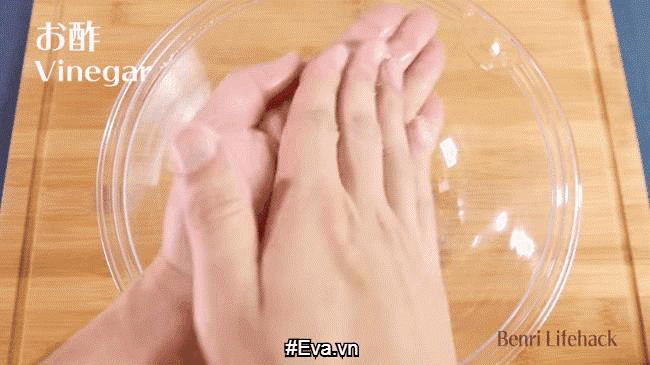 Chắc hẳn trong bếp nhà bạn lúc nào cũng sẽ dự trữ một chai giấm ăn. Sau khi mổ cá xong, rửa tay với nước sau đó rót một ít giấm ra tay. Hứng một chiếc bát bên dưới để giấm không rơi ra ngoài.