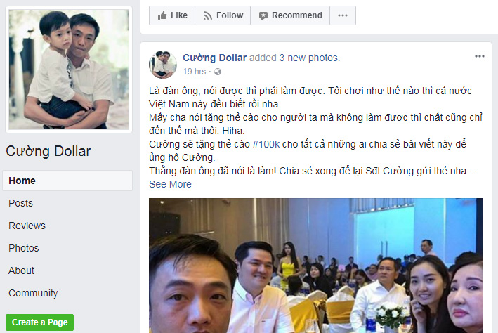 Hơn một ngày qua, cộng đồng mạng xôn xao về một fanpage có tên Cường Dollar tặng thẻ cào trị giá 50 nghìn, 100 nghìn cho những người chia sẻ bài viết từ fanpage này.