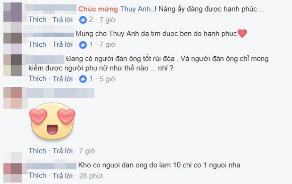 Hai bình luận: "Chúc mừng Thụy Anh! Nàng ấy đáng được hạnh phúc" và
