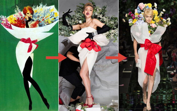 Nhìn một cái là nhận ra ngay đây là sản phẩm "ăn theo", bởi BST mới nhất của Moschino gây ấn tượng mạnh với giới mộ điệu toàn cầu, khi không tập trung vào những mẫu váy áo bình thường mà cả BST ngập tràn sắc hoa với những thiết kế váy áo mô phỏng những bó hoa rực rỡ, tràn ngập sắc màu. Thật ra hai mẫu thiết kế ôm hoa này của Moschino là sản phẩm khắc họa lại bản thảo của René Gruau từ thập niên 20 của thế kỷ trước.