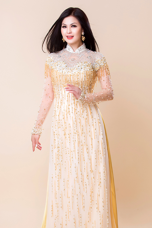 Người đẹp sinh năm 1979 khoe vóc dáng thon gọn trong những thiết kế áo dài cho mẹ uyên ương trong ngày cưới con cái.