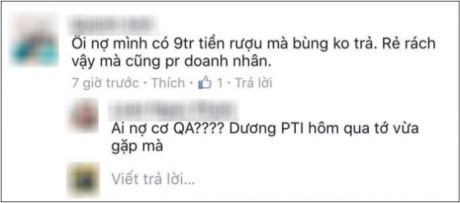 Không chỉ vậy, một tài khoản khác còn lên tiếng việc “đại gia dỏm” họ Phi còn nợ tiền không trả “Ôi nợ mình có 9 triệu tiền rượu mà bùng không trả”. Thậm chí, Facebooker này không ngần ngại gọi bạn trai Phi Thanh Vân là: “Rẻ rách vậy mà cũng tự nhận là doanh nhân”.