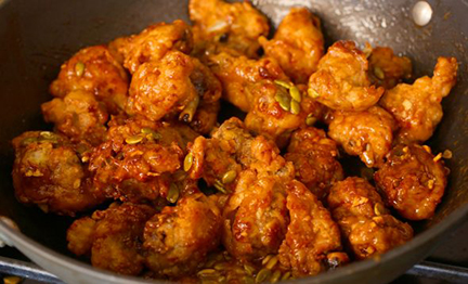 3. Cho tô thịt gà chiên vào. Nếu được thì cho thêm hột bí (hột hướng dương) vào luôn. Trộn đều tay cho tới khi thịt gà được phủ lớp bơ mật ong nhìn thật đã mắt. Tắt bếp.