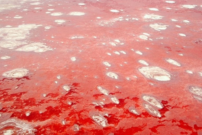 Đó là hồ Natron ở Tanzania. Hồ này có màu đỏ tươi như máu. Một điều kinh dị là bất kỳ loài vật nào sảy chân rơi xuống đều bị hóa đá một cách bí ẩn.