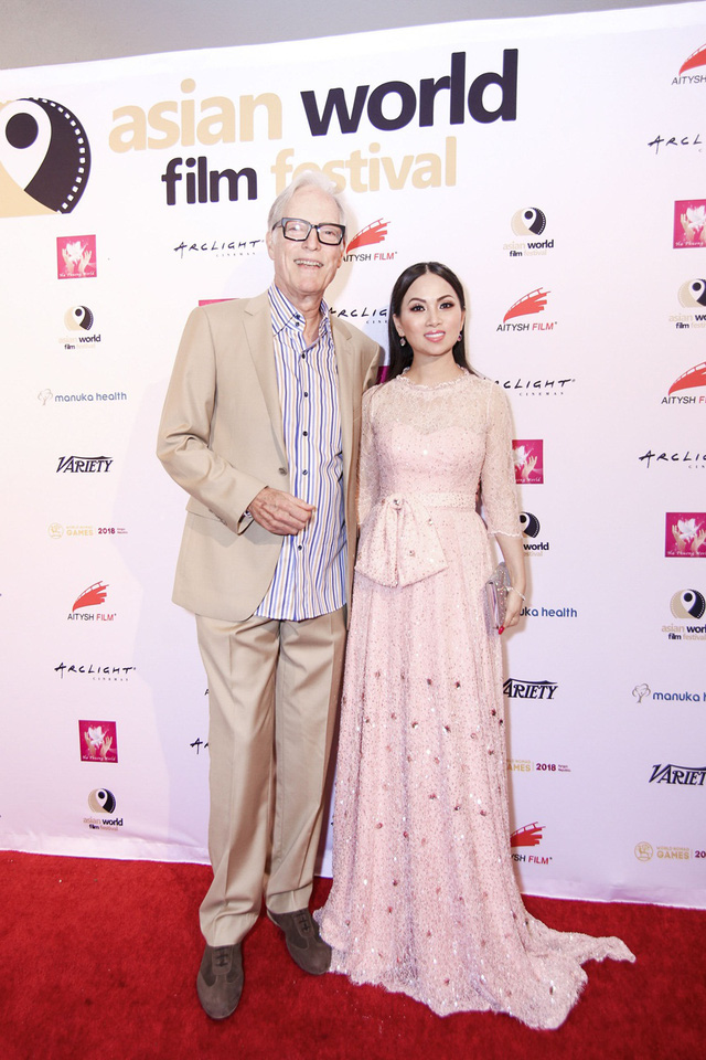 Hà Phương và ông Richard Chamberlain, nam diễn viên Hollywood nổi tiếng với vai diễn linh mục Ralph trong bộ phim kinh điển Tiếng chim hót trong bụi mận gai.