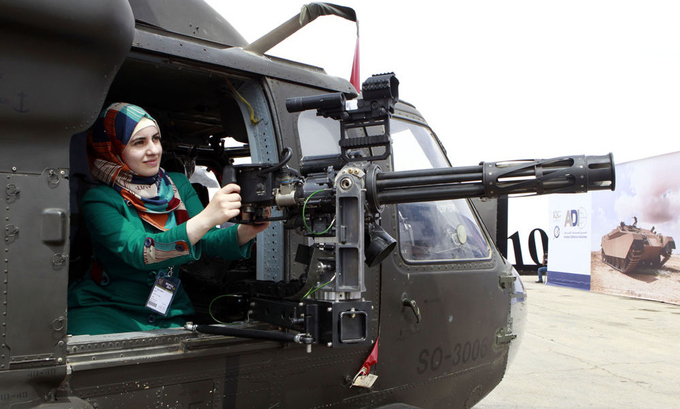 Cô gái này thậm chí còn leo lên chiếc trực thăng quân sự và tạo dáng với súng máy nòng xoay của lực lượng đặc nhiệm Jordan.