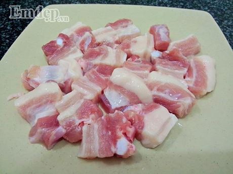 Bước 1: Thịt ba chỉ mua về rửa sạch, thái thành từng miếng dày khoảng 1 cm.
