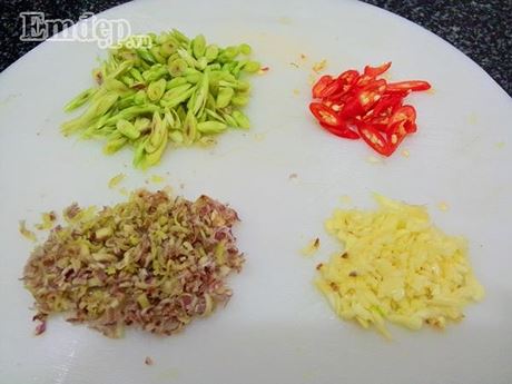 Bước 2: Tỏi đập dập băm nhỏ. sả: phần gốc đập dập băm nhỏ, phần ngọn thái vát. Ớt thái vát.