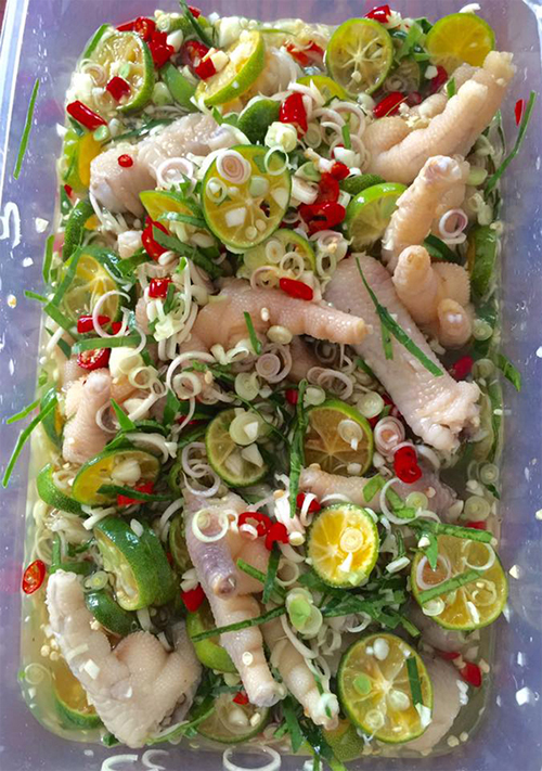 - Chân gà cắt móng, chặt đôi. Dùng rượu trắng, chanh, gừng giã nhỏ, muối, nước chanh bóp cho sạch. Rửa lại với nước vài lần rồi để ráo. Sả rửa sạch chia làm 2 phần. Lấy phần thân bào mỏng (phần 1), giữ lại phần ngọn phía trên (phần 2). Lá chanh rửa sạch, chia làm 2 phần. (Phần 1) khoảng 5-6 lá thái sợi. (Phần 2) để nguyên lá. Tỏi bóc vỏ, bào mỏng.Tắc rửa sạch, cắt lát, bỏ hạt.