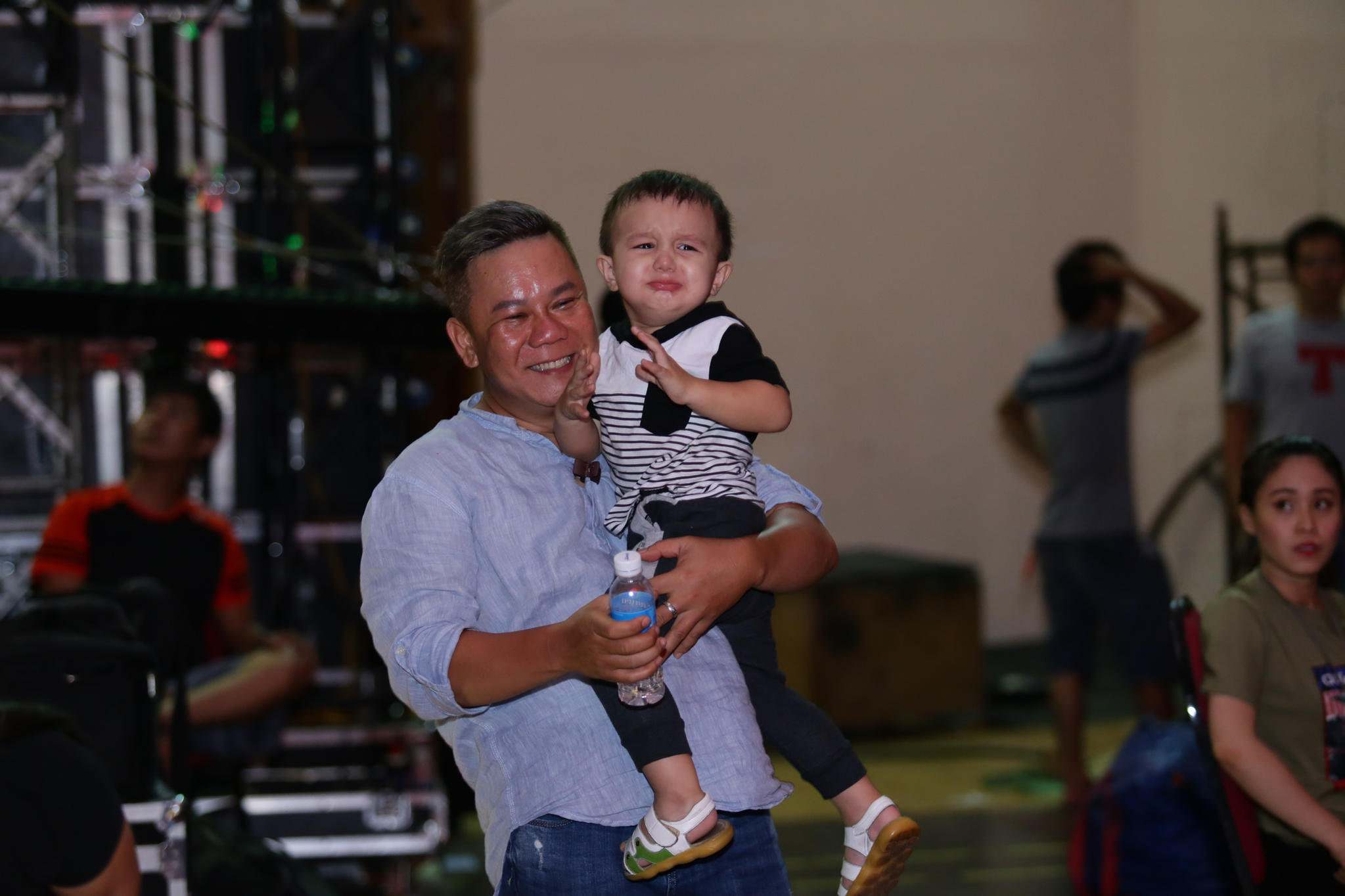 Trong khi đó “bé Bơ” khóc thét khi nghe tiếng nhạc lớn. Lý Thanh Thảo dừng ráp tiết mục, nhanh chân xuống dỗ dành con trai