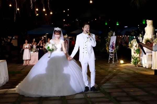 Sau khi tiếp khách xong, cặp đôi đình đám thay ngay trang phục khác để làm lễ. Đây là lúc bạch mã hoàng tử và nàng công chúa xuất hiện giữa một khu vườn cổ tích lung linh ánh nến. Khởi My thật sự xinh đẹp với chiếc váy xoè rộng bằng voan được đính kết ren cao cấp.
