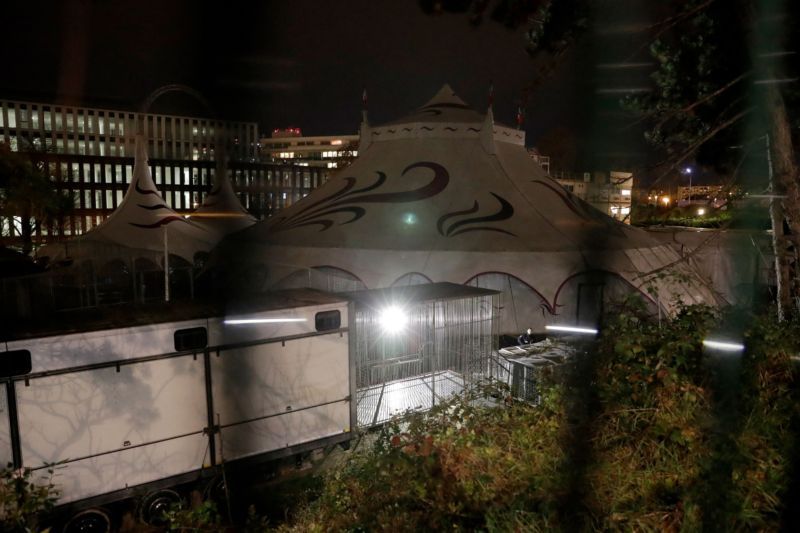 Chuồng sắt để trống của một gánh xiệc tại Paris sau khi xảy ra vụ cọp xổng thoát ra ngoài.